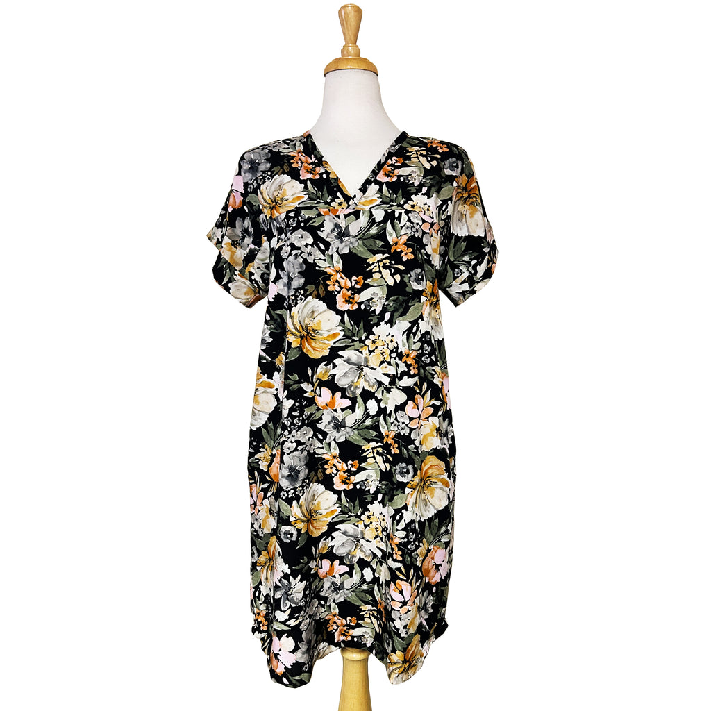 Get ready to turn heads with our Olivia Dress! This classic floral dress with a v-neck and short sleeves comes in a beautiful cream and butter print on a black background. The flattering cut hits just below the knee and can be worn belted or without. Make a statement with this versatile and stylish piece! I wear my belt as a neck tie!